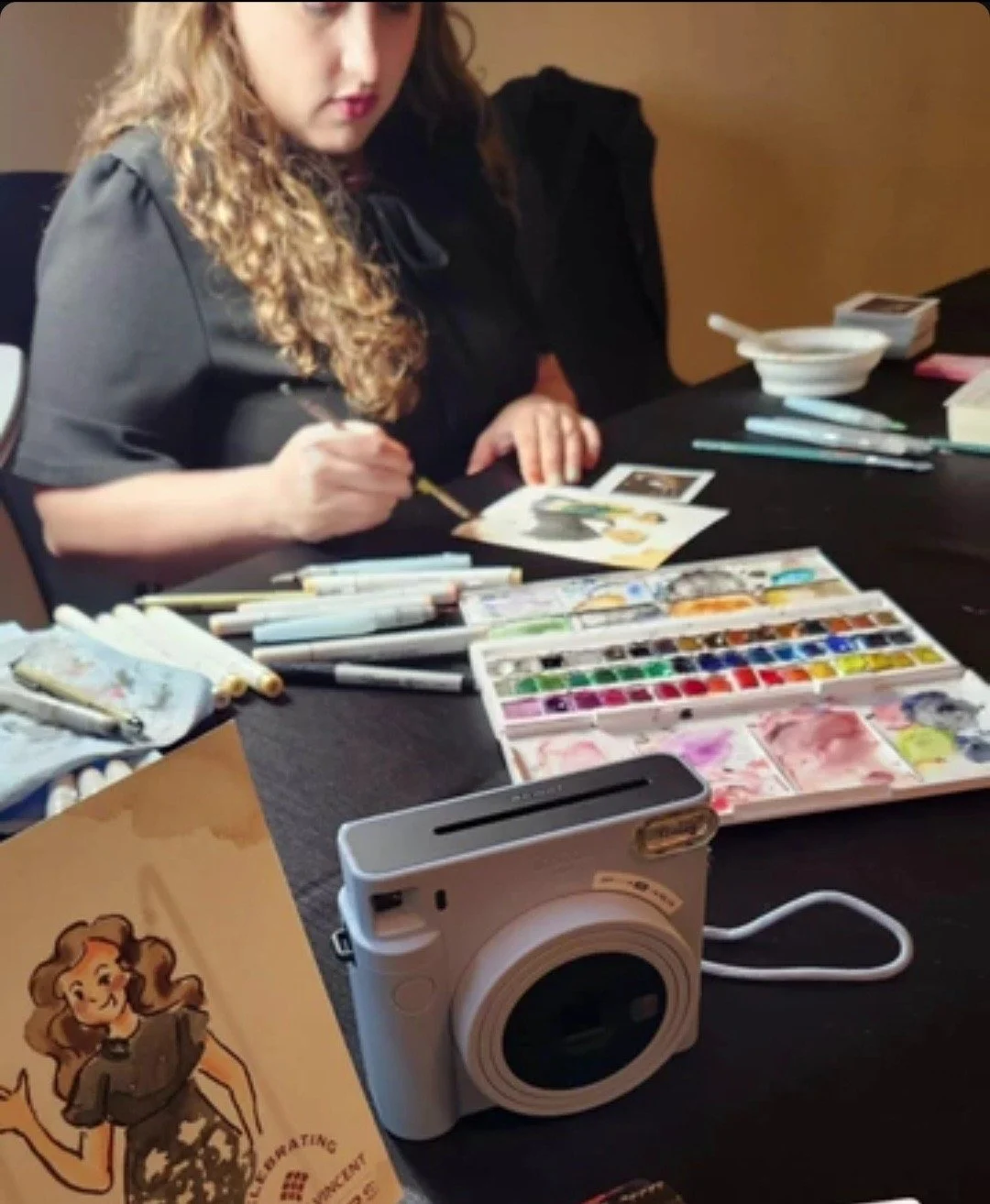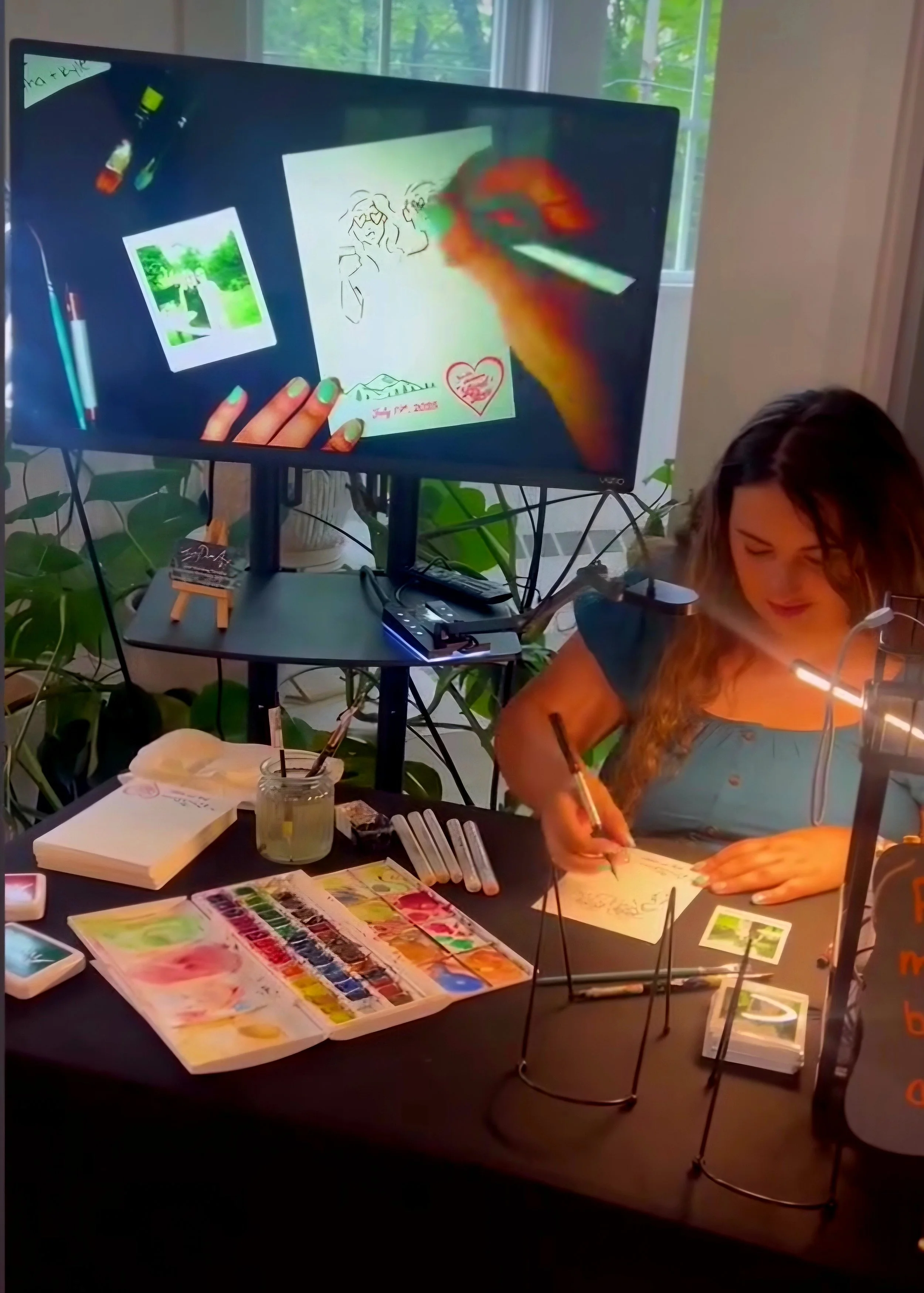 Live Guest Portraits are created in watercolor, gouache, and ink, and portraits can take 6-10 minutes for an individual or two guests per paper. Each illustration includes an instant film photograph and a protective sleeve. Portrait papers can be customized to fit the vibe of your event, adding an extra special touch of customization to reflect your personality! For events within driving distance of Erie, PA, a television with a live feed of me drawing in real-time is available, allowing guests to watch the illustration magic from afar.