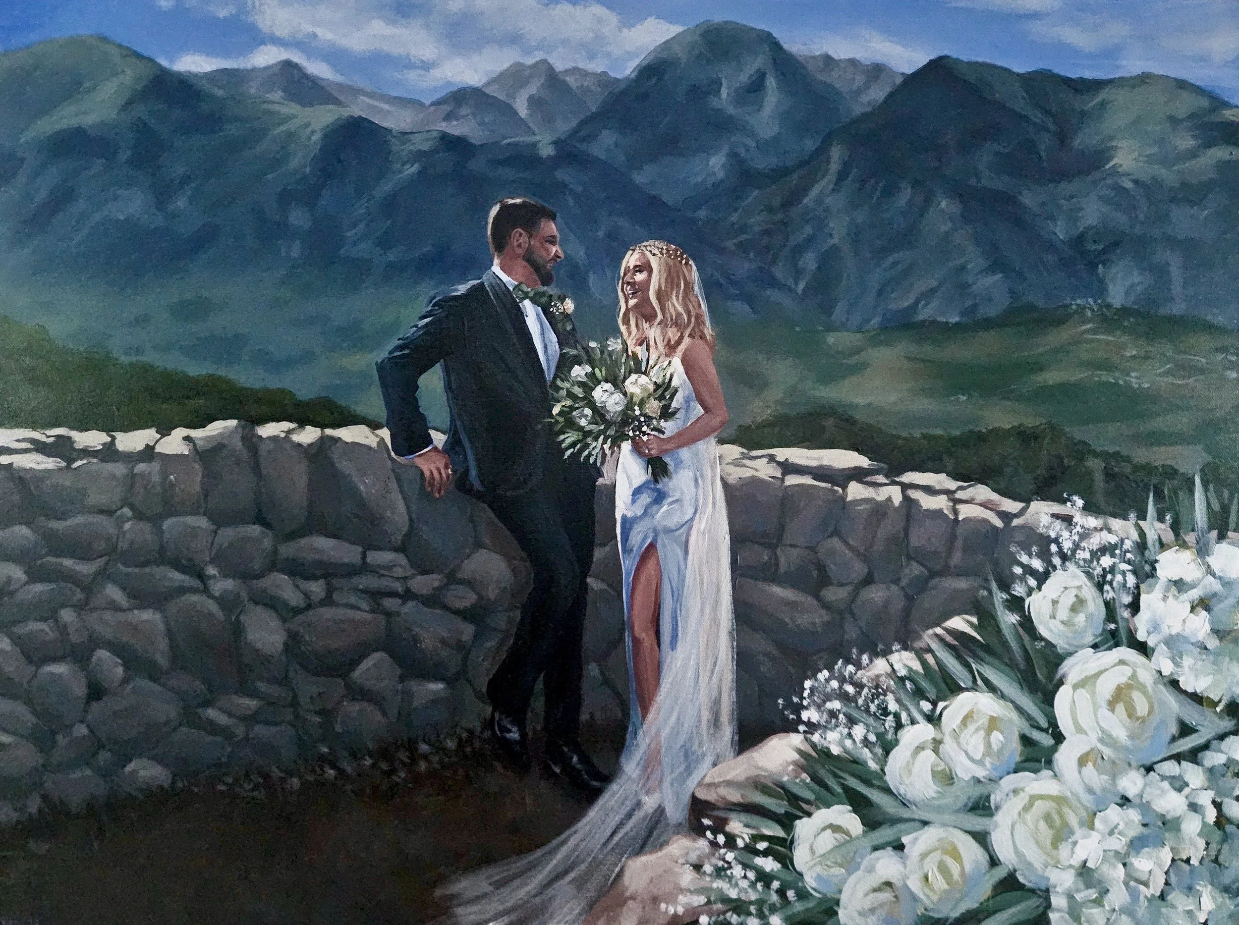 The Moon Package is an intimate live wedding painting experience focused entirely on the couple. The painting is created live on an 18 × 24 inch archival canvas, capturing a romantic moment from your wedding day as it unfolds.